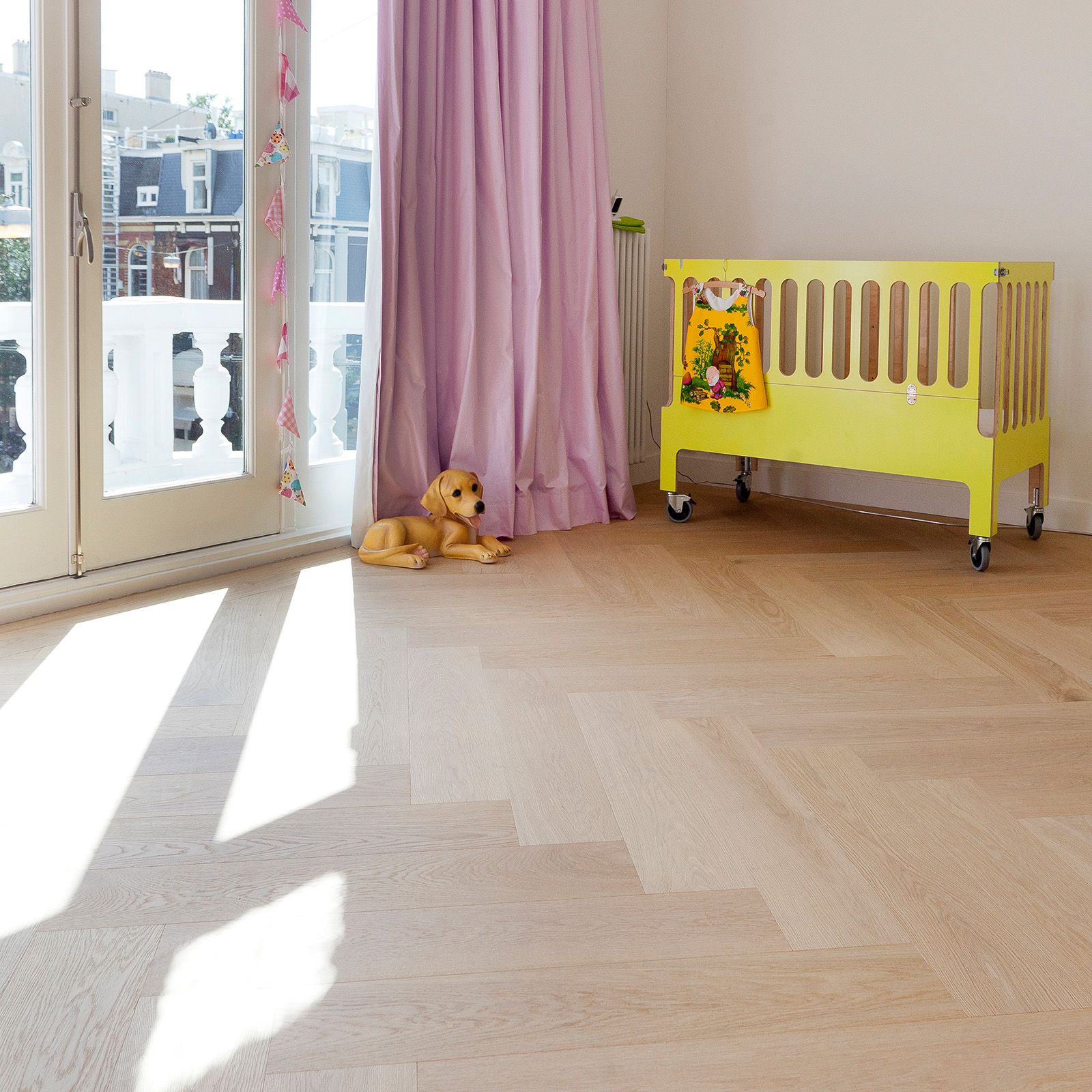 A large herringbone pattern in engineered Continental Oak anchors the space. The Faded Ultramatt Poly finish on the Oak planks adds a soft, natural glow, enhancing the bright ambiance and harmonizing with the muted color palette, striking a balance between contemporary and classic.