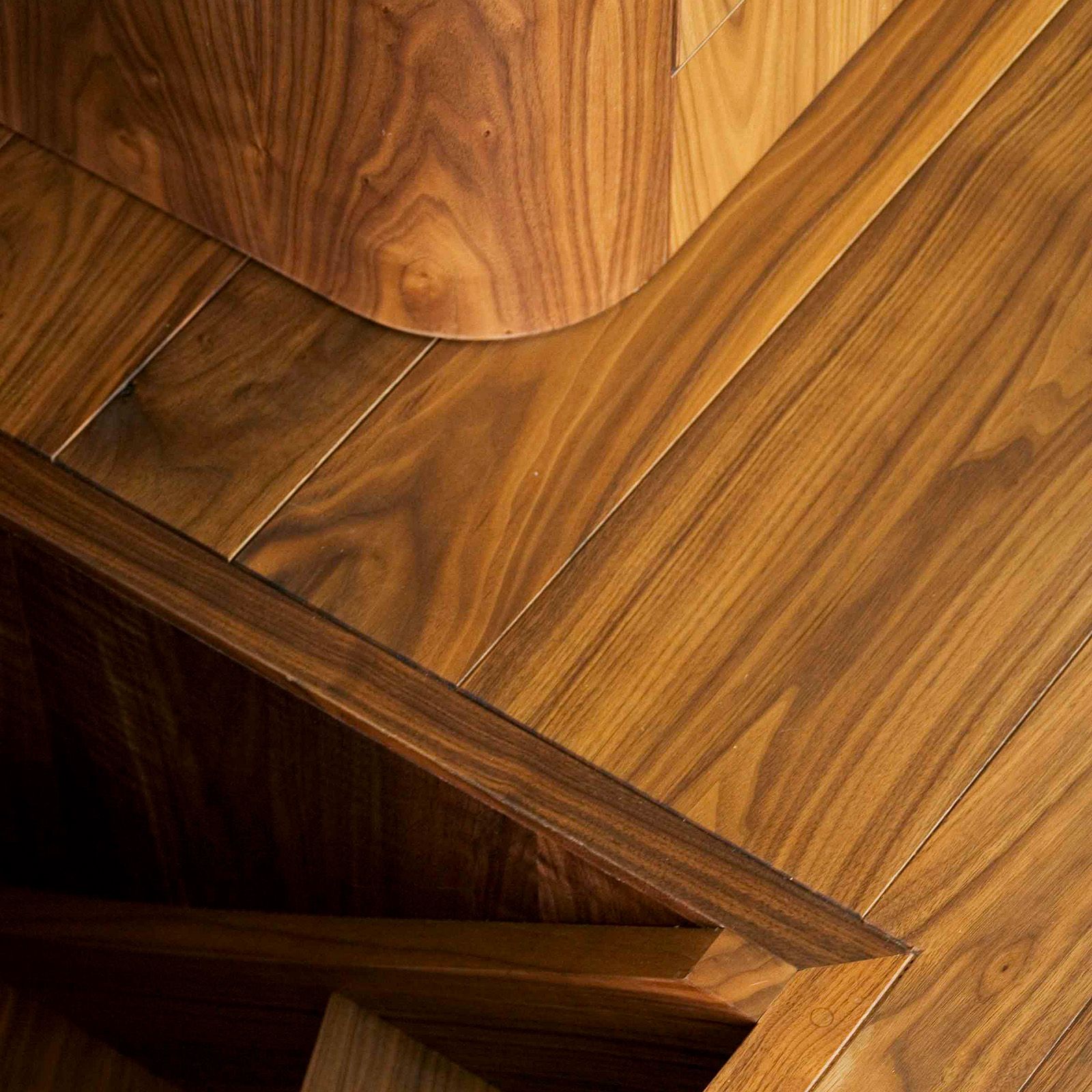 Floor and Interior:American Walnut Select Grade, finished with Tung Oil Hardwax, in random widths of 12-25 cm.