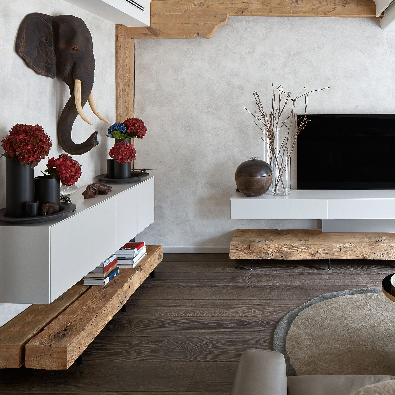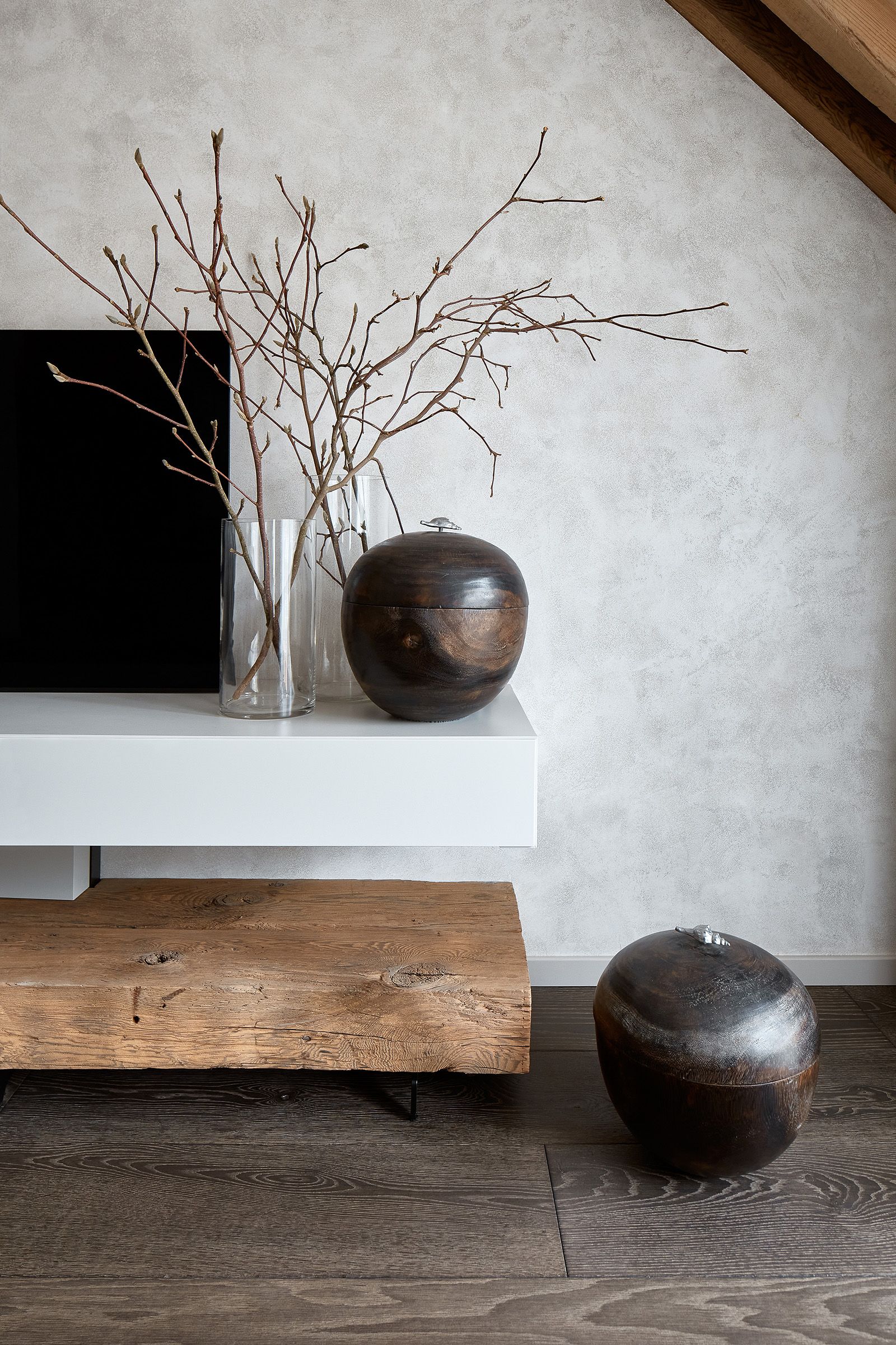 In the living room, the rich tone of the Megeve Lava finish creates a warm backdrop for natural wood, sculptural ceramics, and soft neutral tones.