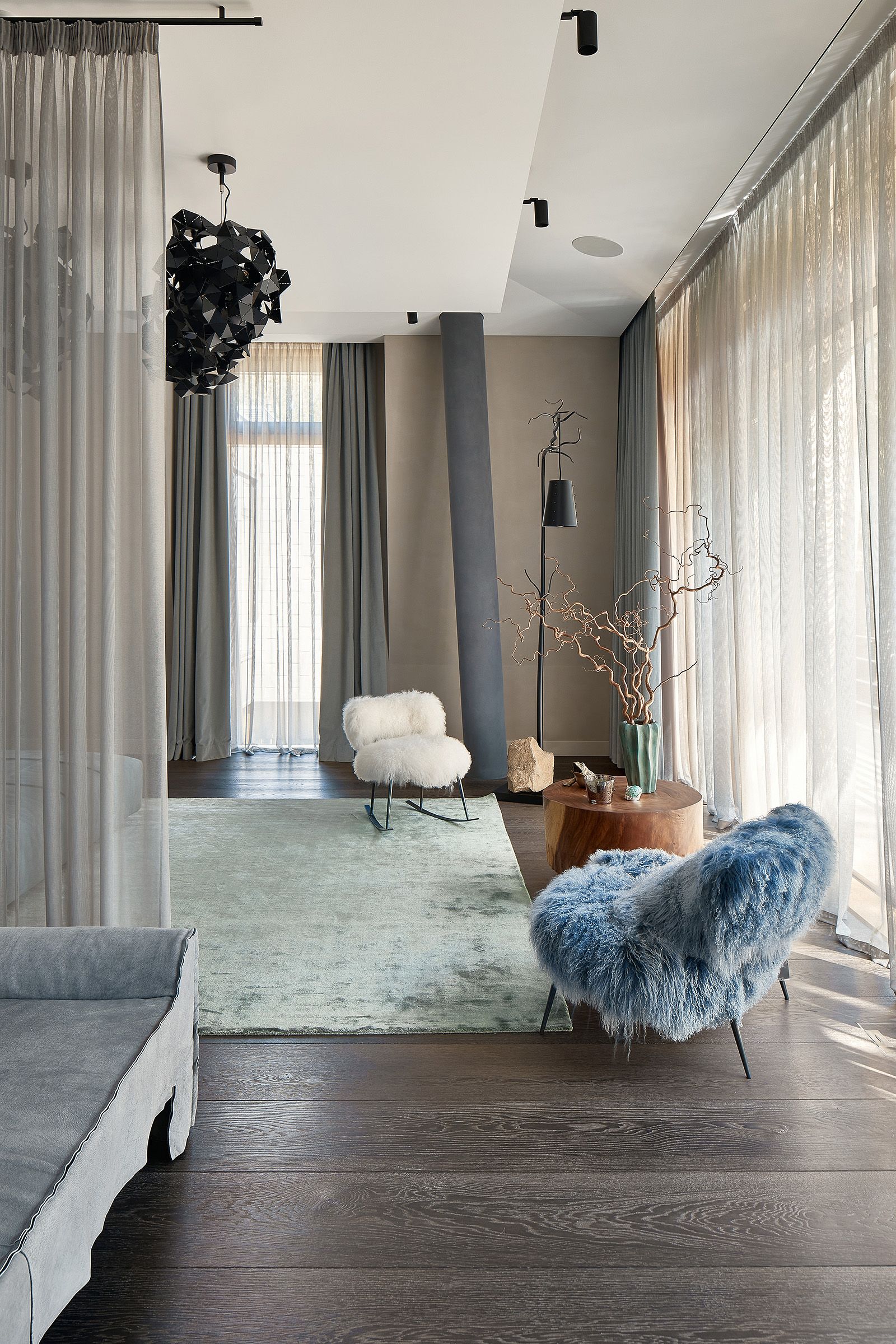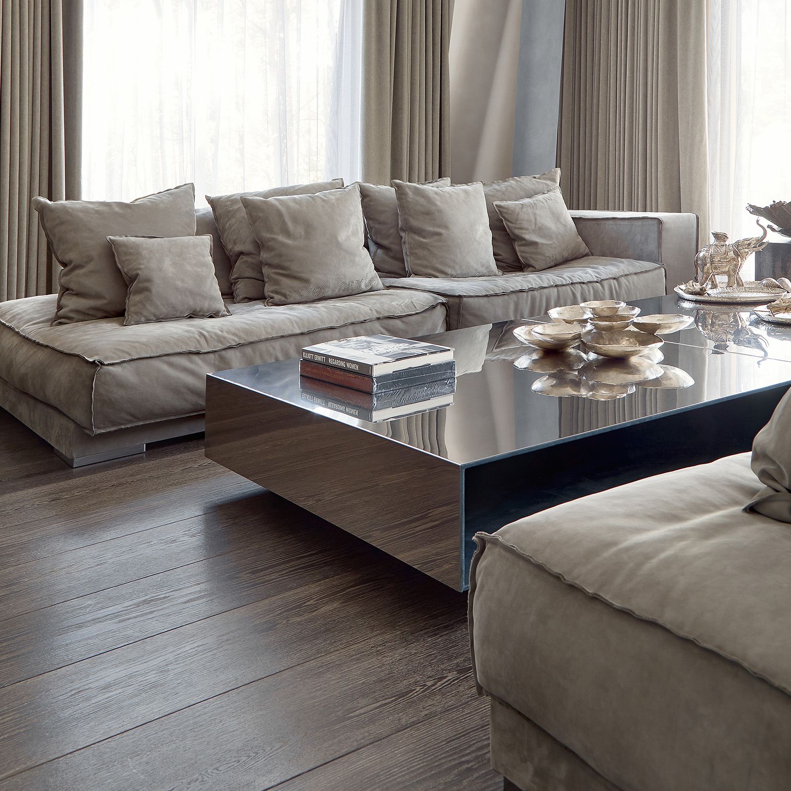 In the living spaces, the soft tone of the Megeve Lava finish adds depth while allowing furniture and textures to stand out gently against the floor.