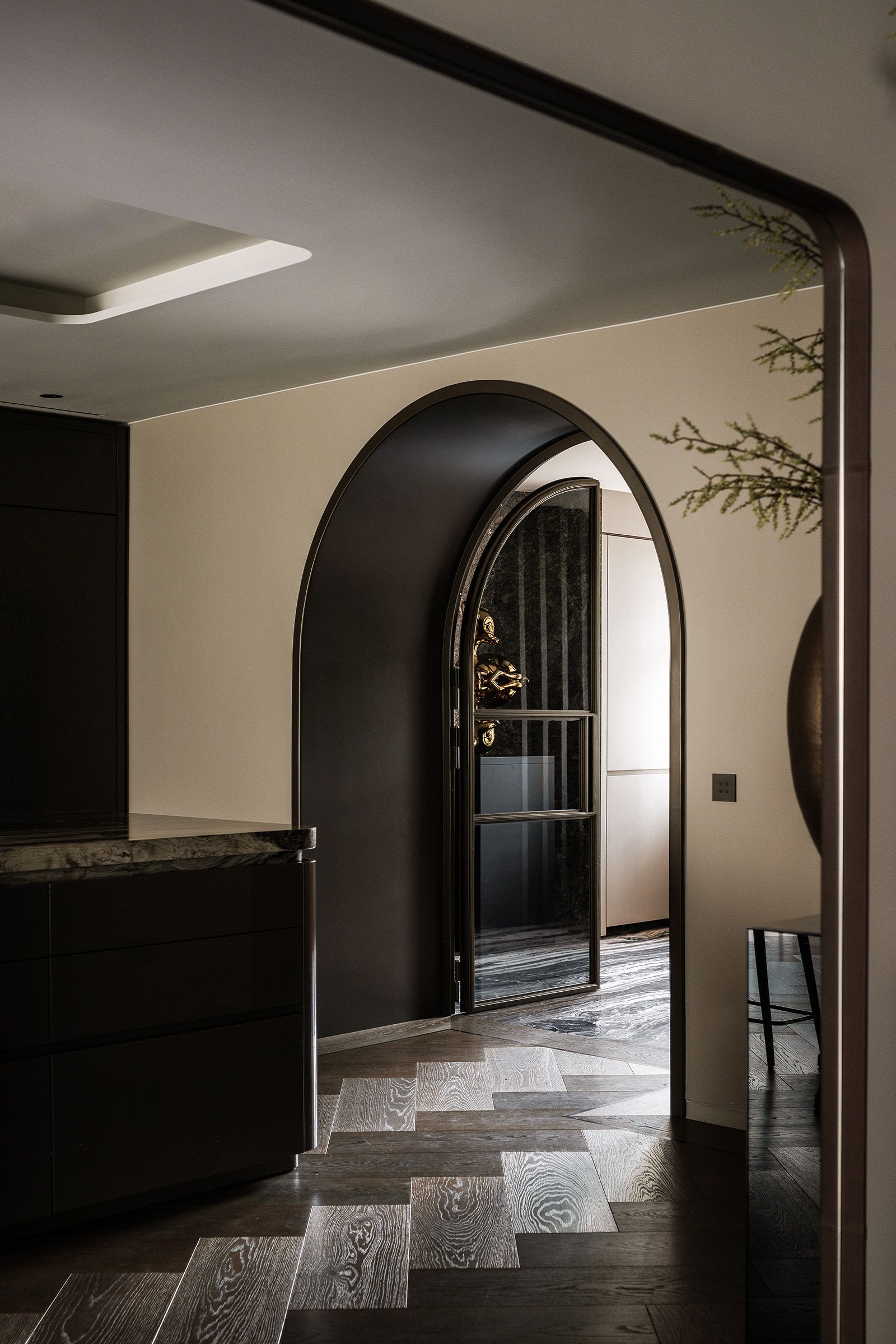 Our Continental Oak, Fusion Select with a bespoke finish, runs throughout the home. The 26 × 78 cm wide herringbone is paired with aged bronze metal inlays, introducing a subtle rhythm that connects each space while responding gently to light and movement.