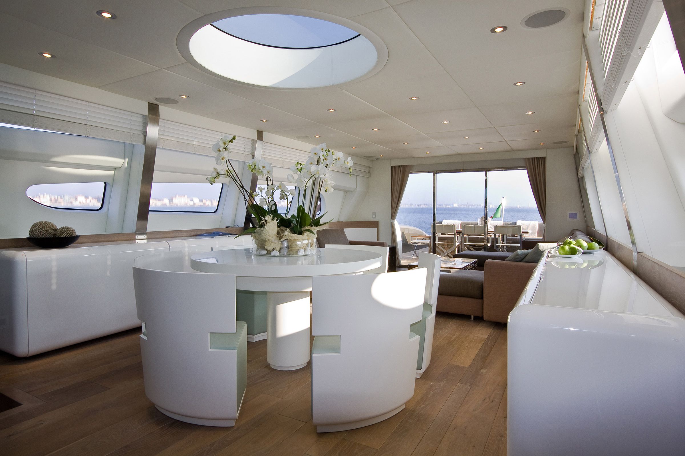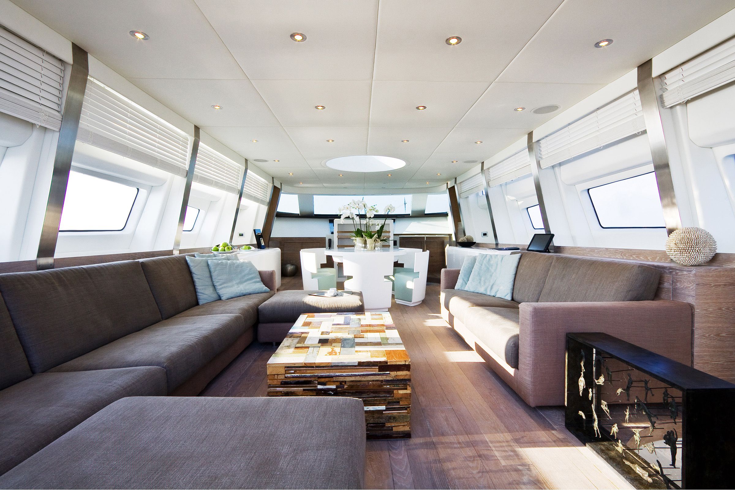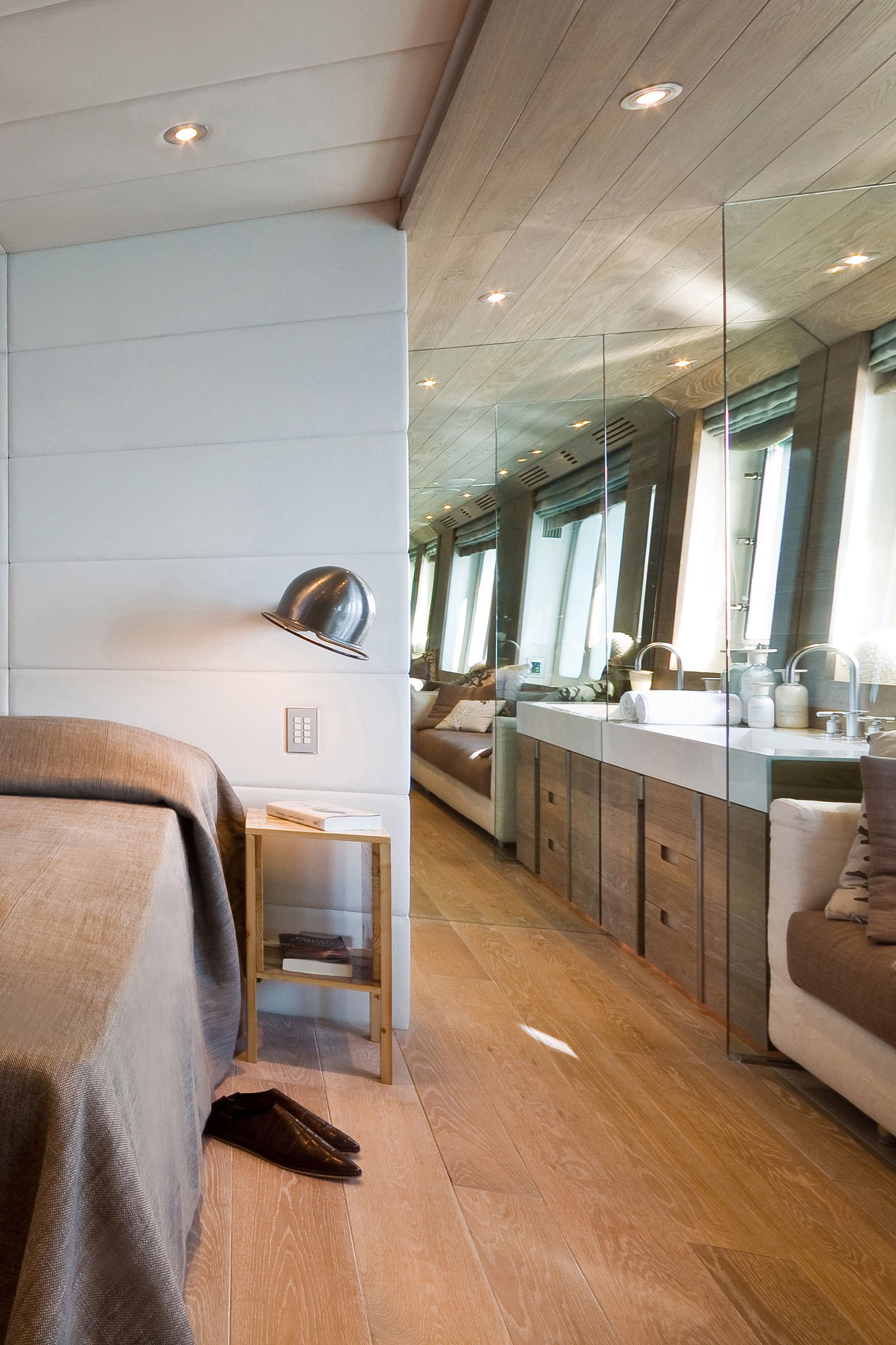 Each plank's custom widths and unique finishing contribute to the bespoke nature of the yacht, blending modern design with traditional craftsmanship for a timeless, distinct interior.
