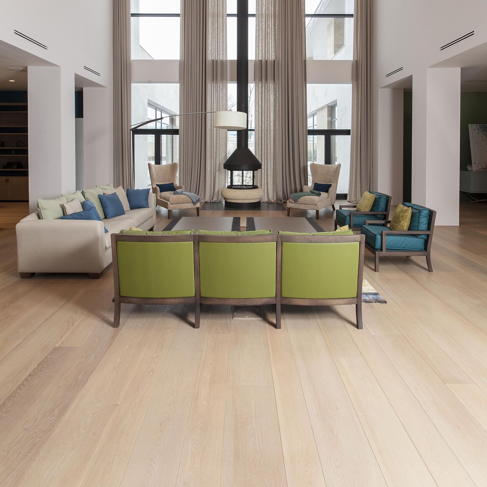 Wide planks, 17 to 35 cm in width, amplify the space's grandeur and openness. Architectural elements like curved staircases and expansive windows are beautifully complemented by the flooring, anchoring the design in a timeless aesthetic.