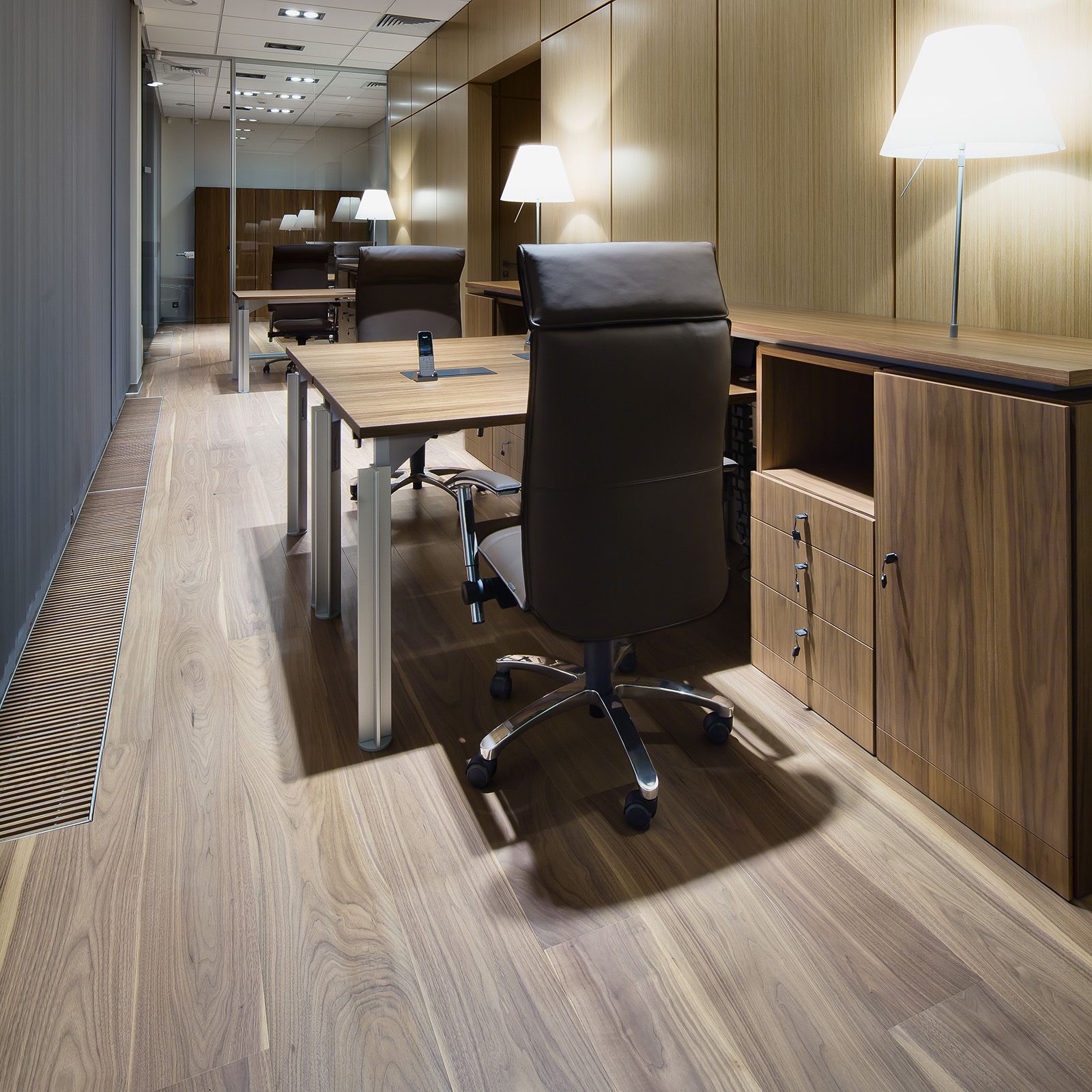 The office flooring is crafted from Engineered American Walnut Fusion Select Grade, known for its rich tones and fine grain.