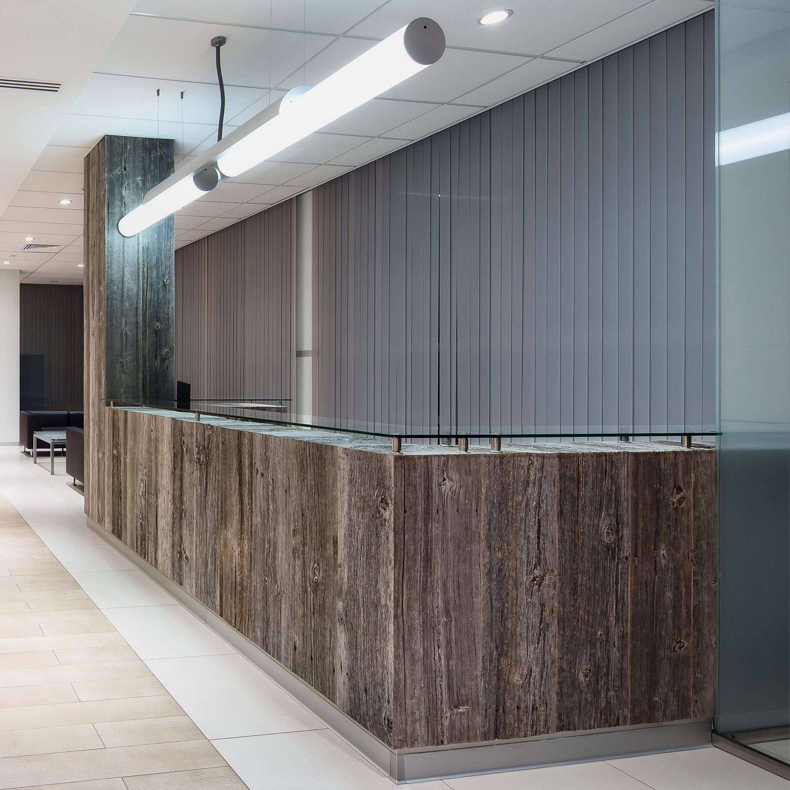 In contrast, the bar area features Antique Canadian Barnwood paneling with a Weathered Silvergrey finish, adding rustic texture to the sleek office. This juxtaposition adds character and reflects the bank's heritage while embracing a modern aesthetic.